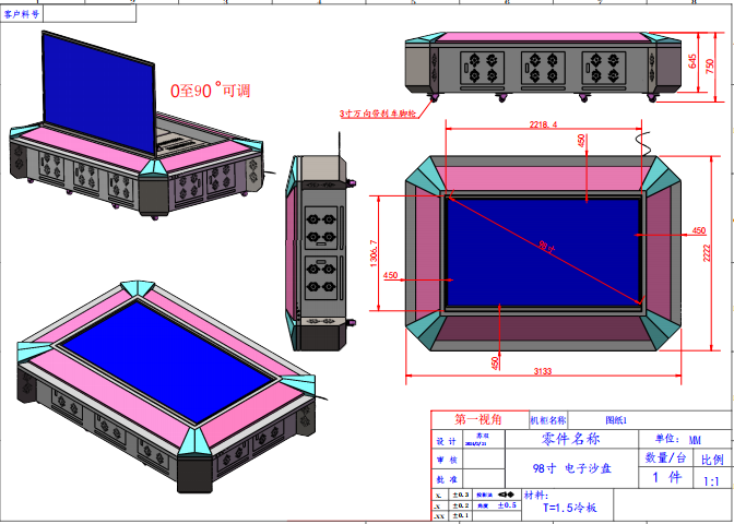 多重保护,短路保护,过载保护,同步偏差超限保护,控制方式为有线手柄/开关/PLC 继 电器/无线遥控器,可选 485 通信,可与其他设备通信,默认点动,可自由切换自动/点动; 支持屏幕升降调节,屏幕后托采用硬度较高金属材质拼接组成,安装于屏幕背面,与 屏幕连接牢靠稳固。可将屏幕升起到 0 至 90 度任意角度,起落过程应当平稳、流畅、无 噪音边框内边与屏幕平齐; 框架采用模块化设计, 内部主框架大于 1.5mm 冷轧钢板,采用防静电喷塑。前后门 板大于 1.0mm 冷轧钢板,电子沙盘底部设计空间大,可容纳放置电动推杆起落装置,图 形工作站,视频工作站。同时四周有可拆卸金属门,门上均有散气孔,可实现空气对流通畅, 使设备安全性得到有效保证; 支持按键操作及遥控器操作:按键搭配不锈钢金属 22mm 防水按键,独立灯带开关按 钮,升起按钮,降落按钮,备用按钮,也可以根据客户需求定制按钮。 |